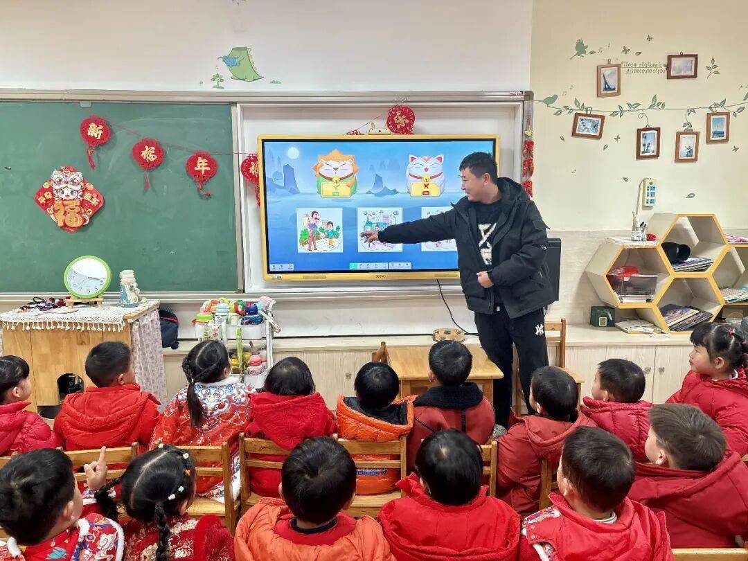 运动中,之昂爸爸连接颜色瑰丽的绘本画面,用活跃情景的讲话、妄诞趣味的心情和举动,把“年兽”的传说娓娓道来。从年兽的外形特质,到人们用红绸、鞭炮驱赶年兽的聪敏,再到春节习俗的由来,这些都牢牢捉住了孩子们的提防力。孩子们时而睁大眼睛好奇聆听,时而举起小手主动提问,现场互动气氛强烈。讲到人们贴对联、放鞭炮庆贺新年的情节时,孩子们纷纷分享起我方家里过春节的趣事,稚嫩的话语里全是对新年的等待。